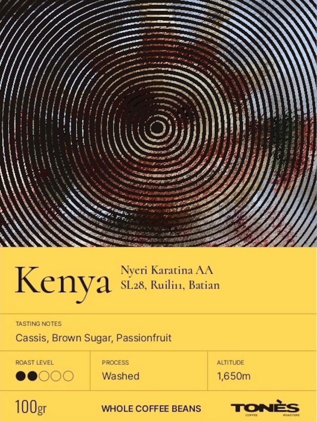 -     Kenya Nyeri Karatina AA 100g ¥1,200 Kenya Nyeri Karatina AA _VARIETY SL28, Ruili11, Batian _ PROCESS Washed _ ALTITUDE 1,650m _TASTING NOTES Cassis, Brown Sugar, Passionfruit _ ROAST LEVEL ●●◯◯◯ 内容量100g